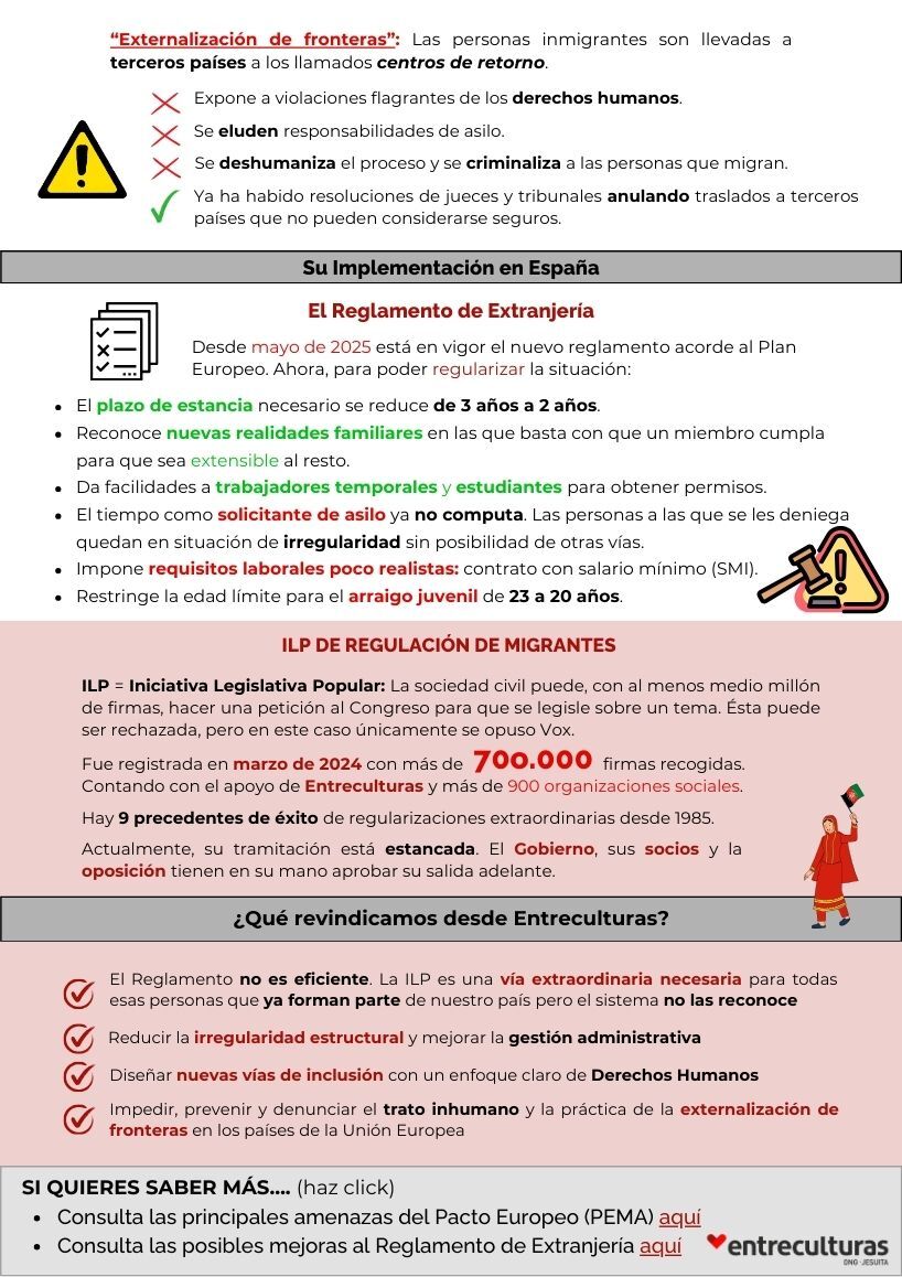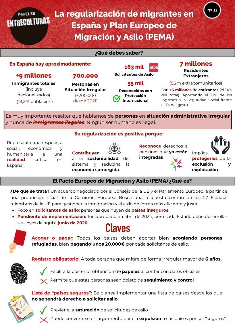 La regularización de migrantes en España y Plan Europeo de Migración y Asilo (PEMA)La migración es un fenómeno humano que hoy ocupa un lugar central en los debates políticos y en nuestras conversaciones cotidianas. En la agenda de la Unión Europea, el control migratorio se ha convertido en un eje clave que ha dado lugar al Plan Europeo de Migración y Asilo (PEMA). Sin embargo, en vez de reconocer la migración como parte inherente de nuestra historia y abrir vías legales y seguras que pongan a las personas en el centro, este plan avanza en una lógica de securitización de un tema que es, ante todo, de derechos humanos.En España, la entrada en vigor del nuevo Reglamento de Extranjería refleja las mismas tensiones: se prioriza el control antes que la protección.En este número de Papeles resumimos los principales desafíos, oportunidades y recomendaciones que plantea la implementación de estos nuevos marcos en nuestro país y en Europa.